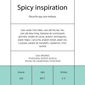 Ingrediente: Batoane de scorţişoară, ghimbir, anason, anason stelat, coajă de cacao, ceai negru Darjeeling, coajă de portocală, cardamon, cuişoare, petale de trandafir, guarana, chili